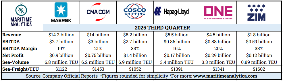 Freight rate/TEU: $1,602 (–35% YoY, Q3)