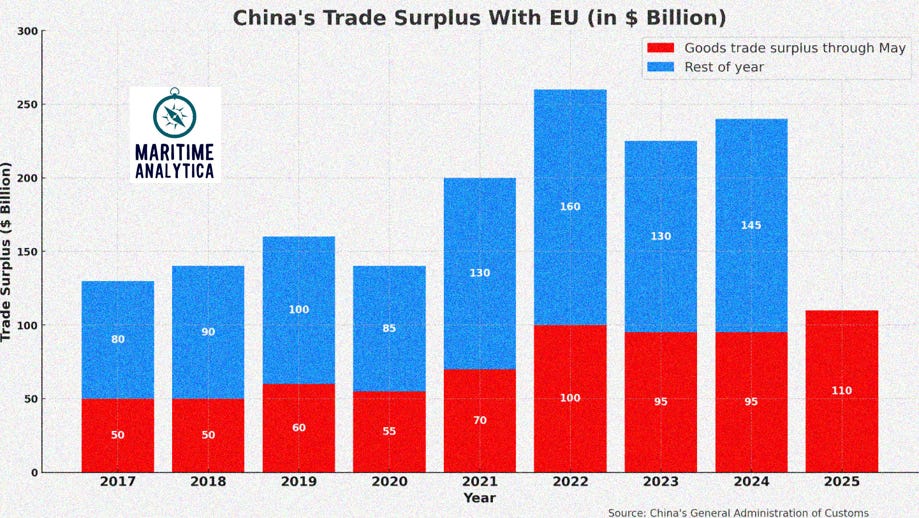🏅Maritime Analytica: “Europe offshored its factories, then its leverage. With $110B already in surplus, China isn’t just exporting goods—it’s exporting dominance. EU must shift from reaction to reinvention or fall further behind.”