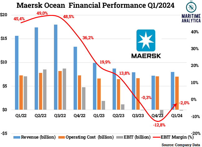 🌊 Maersk Ocean's performance in Q1/24 outpaced that of Q4/2023, driven by favorable sea freight levels.