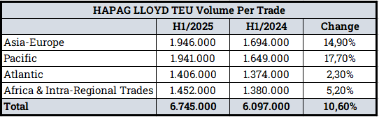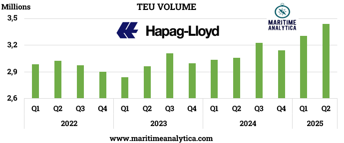 💡 Maritime Analytica Insight — Despite tariff pressures, Hapag-Lloyd’s Q2 transport volumes rose +11% YoY to 3.44M TEU, proving demand resilience despite cost friction.