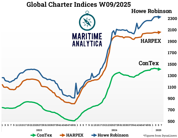 Containership charter rates remain stable despite falling freight rates, driven by strong demand and limited vessel availability. The 1,700 TEU segment sees the most activity, with operators securing long-term charters. Panamax and feeder vessels also remain in high demand, keeping competition strong.