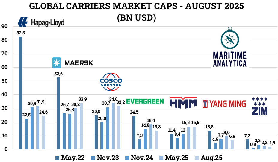 August leaders: COSCO $34.0B, Maersk $33.9B, Hapag-Lloyd $24.6B.