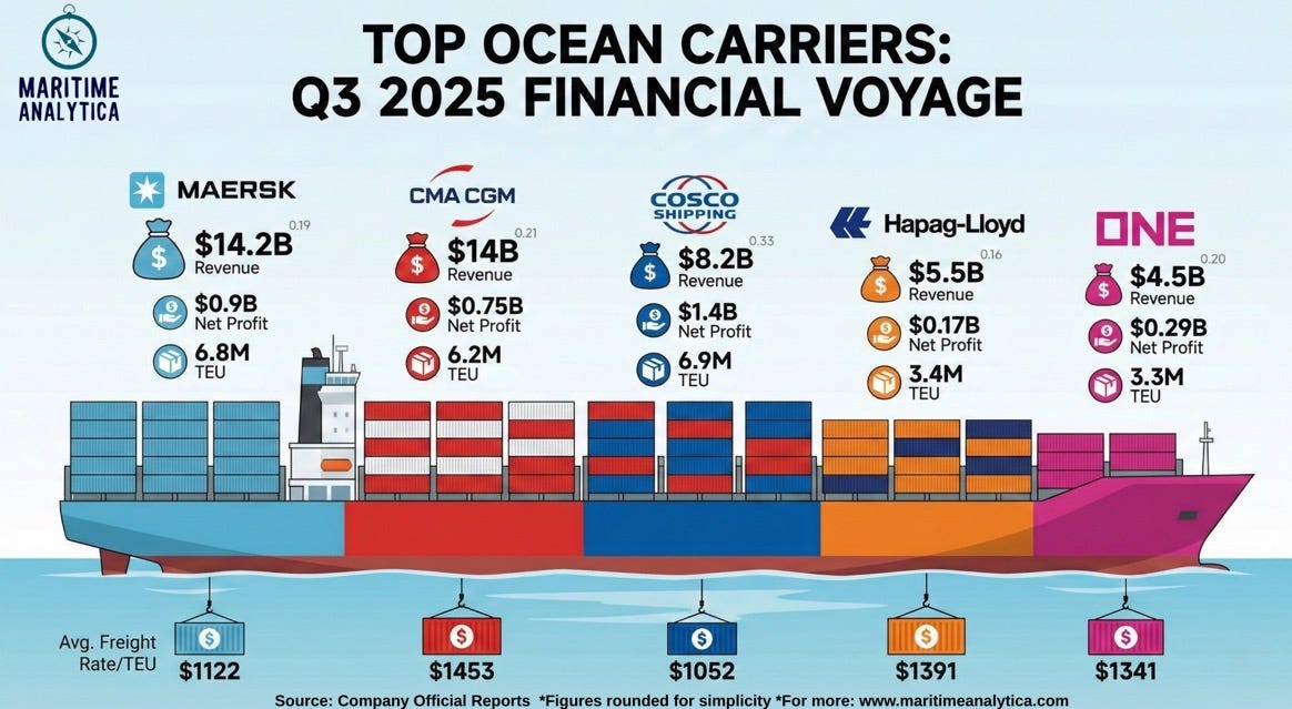 📊Q3 Consolidated Revenues: Maersk $14.2B – CMA CGM $14.0B – COSCO $8.2B – Hapag-Lloyd $5.5B – ONE $4.5B – ZIM $1.8B