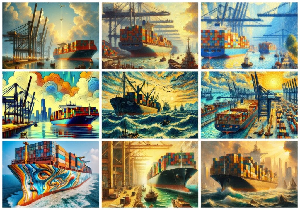 Dive into a world of stunning visuals, meticulously crafted by the magic of AI, capturing the spirit of renowned painters that transcend time. 🚢🎨 Let the waves of creativity wash over you as we sail through the artistic wonders of container shipping! ⚓✨