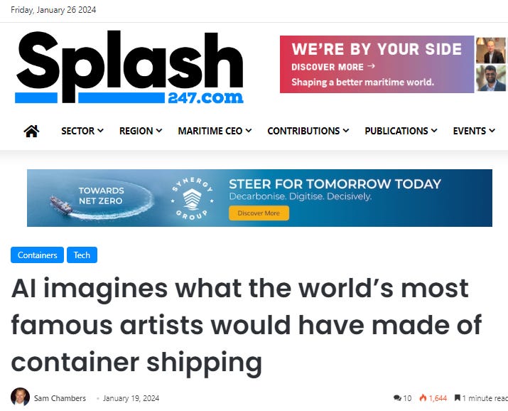 We are thrilled to see our company, Maritime Analytica, featured in a news article for 'The Maritime Art Edition'—a stunning collection of container ship visuals crafted using artificial intelligence. 🚢✨