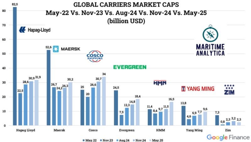 Hapag-Lloyd AG rebounds to $31.9B but still far from its May-22 peak ($82.5B).